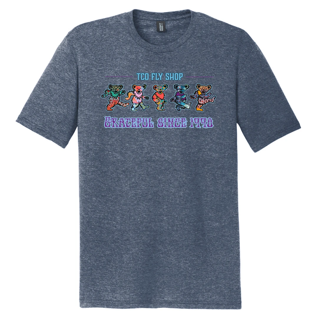 Our latest collaboration with our buddy Derek DeYoung is one of our favorites! This design has been floating around in our heads for a while… and finally came to life! Each Grateful Bear is wearing a different DeYoung Fish Print. Celebrate 30 years of TCO with this limited edition T-shirt. Available in tie dye and heather navy.