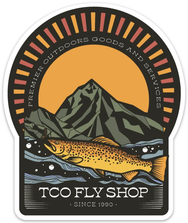 The mountains are calling, and we’re picking up the call. This sticker channels TCO’s love for a beautiful sunset and trout rising to a hatch.